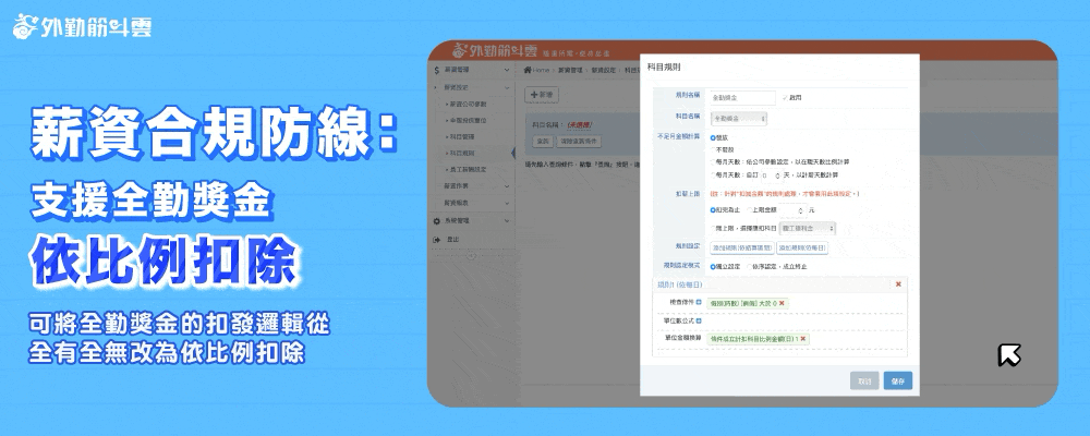 - 薪資模組自動合規: 薪資模組與考勤資料高度整合,可將全勤獎金的扣發邏輯,調整為符合新制要求的精準比例扣除,徹底消除人工計算錯誤和違法風險。